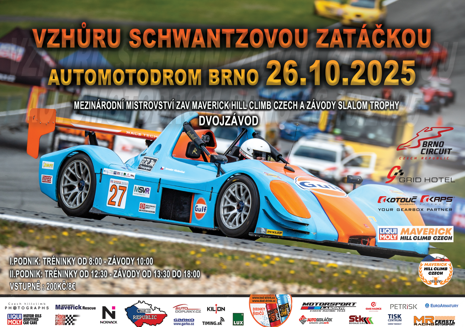 DNES VE ČTVRTEK 9. 10. 2025 V 18:00 HODIN SPOUŠTÍME PŘIHLÁŠKY NA ŠESTÝ PODNIK MEZINÁRODNÍCH ZÁVODŮ MMZAV LIQUI MOLY MAVERICK HILL CLIMB CZECH A MZAV MAVERICK SLALOM – TROPHY 26. 10. 2025 (DVOJ ZÁVOD) VZHŮRU SCHWANTZOVOU ZATÁČKOU AUTOMOTODROM BRNO.